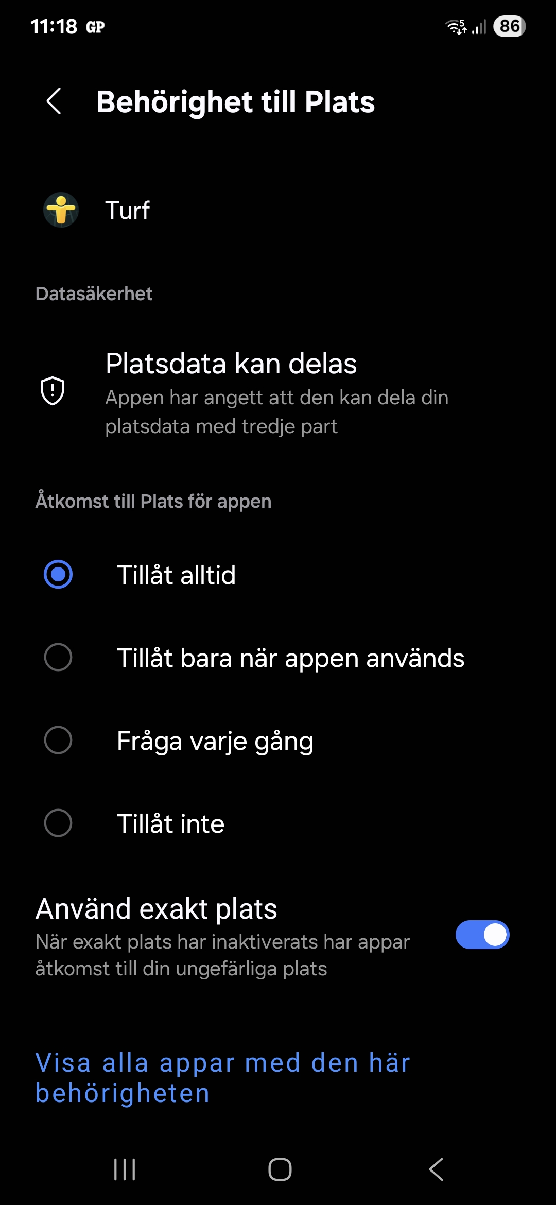 You need to change the gps permissions for turf to Always. That should help. I couldn't see your screenshot, so I don't know what setting you found.